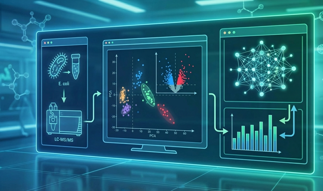 En este proyecto ustedes utilizarán el dataset experimental MSV000085443 del repositorio de MassIVE para realizar el análisis bioinformático del metaboloma bacteriano. Se realizará el procesamiento de datos crudos de LC-MS/MS mediante XCMS para la detección de picos y eliminación de ruido, seguido de la aplicación de estadística multivariada (PCA y “volcano plots”) en MetaboAnalyst para identificar metabolitos con abundancia diferencial entre las las condiciones de cultivo de E. coli del estudio.